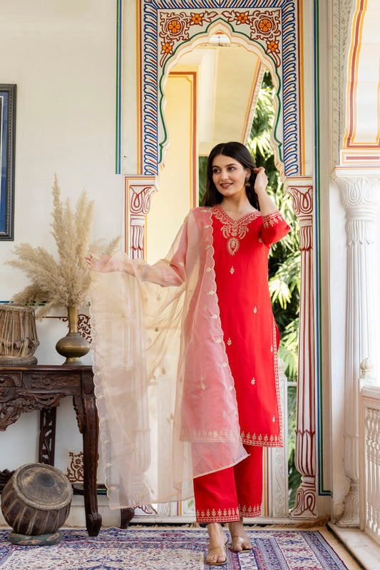 Pure Cotton Thread Work Kurta Pant Dupatta Set