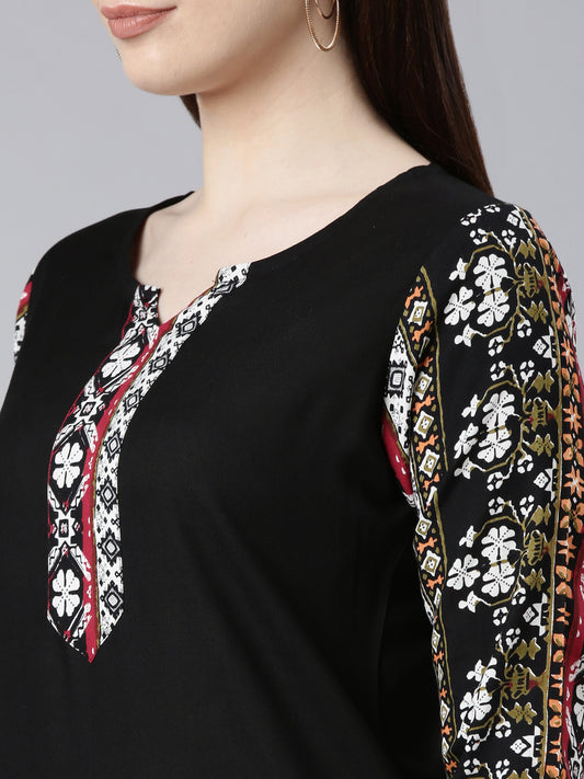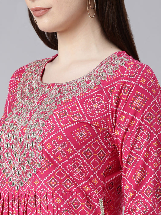Rayon Bhandej print embroidered nira cut kurta pant set