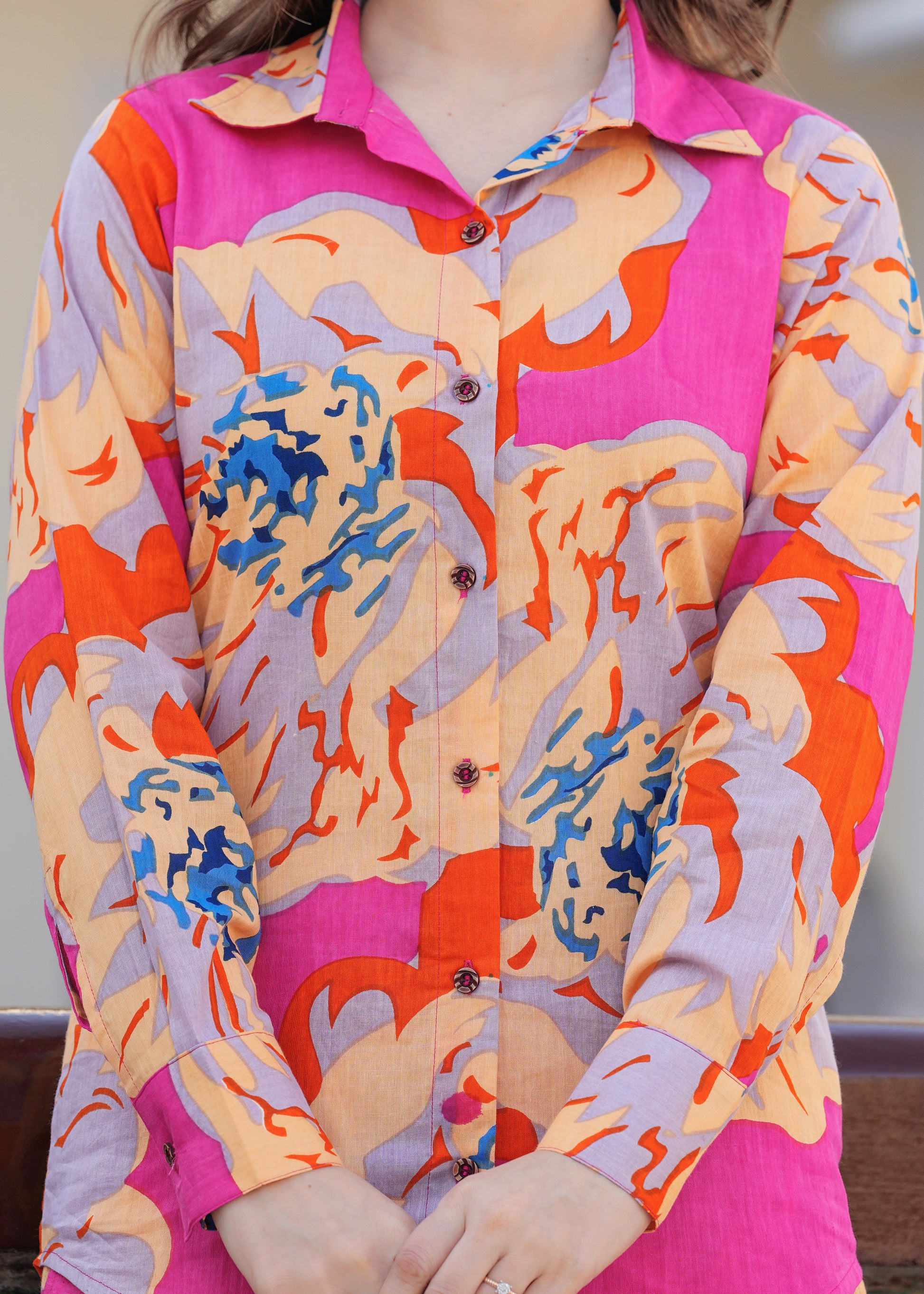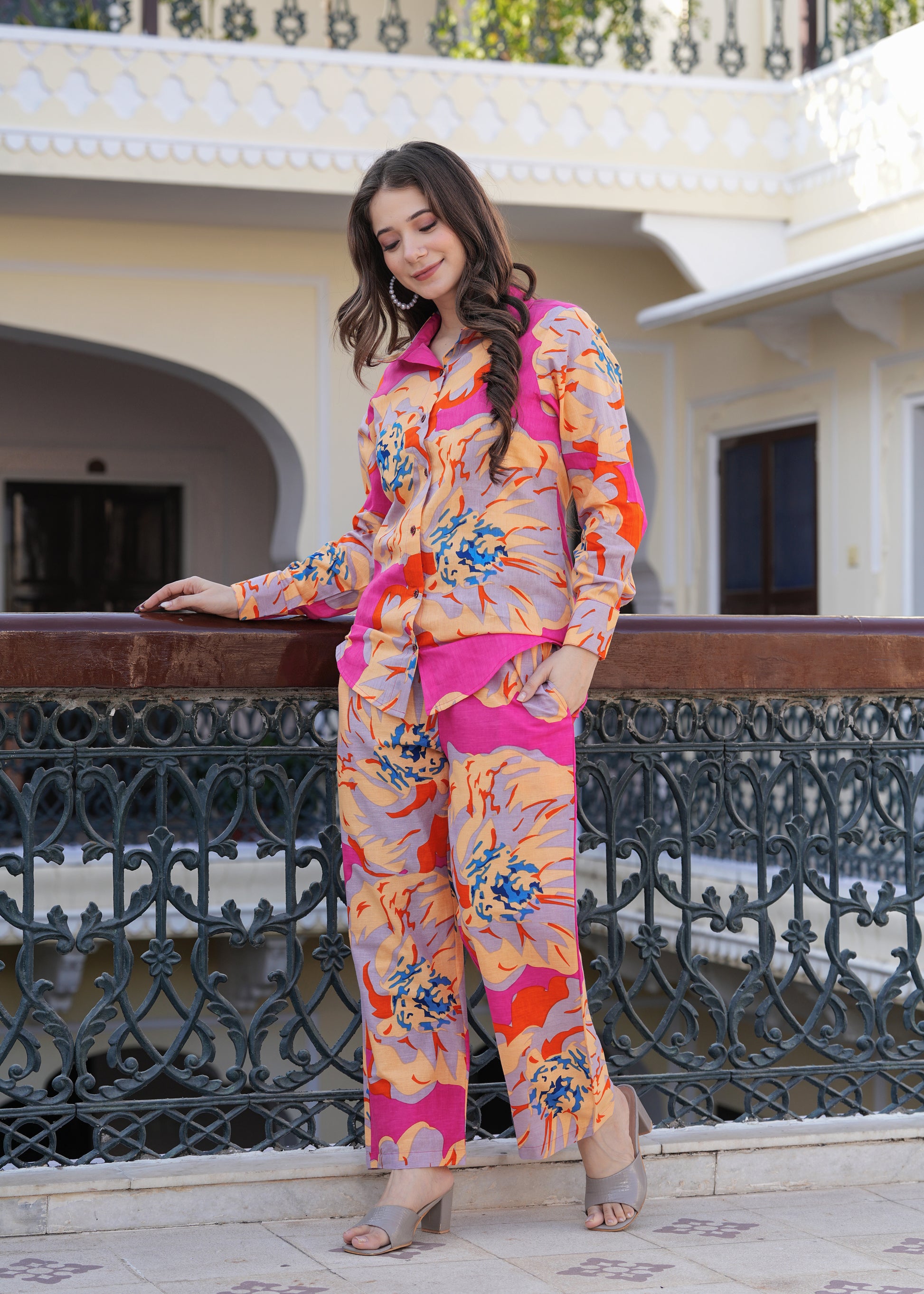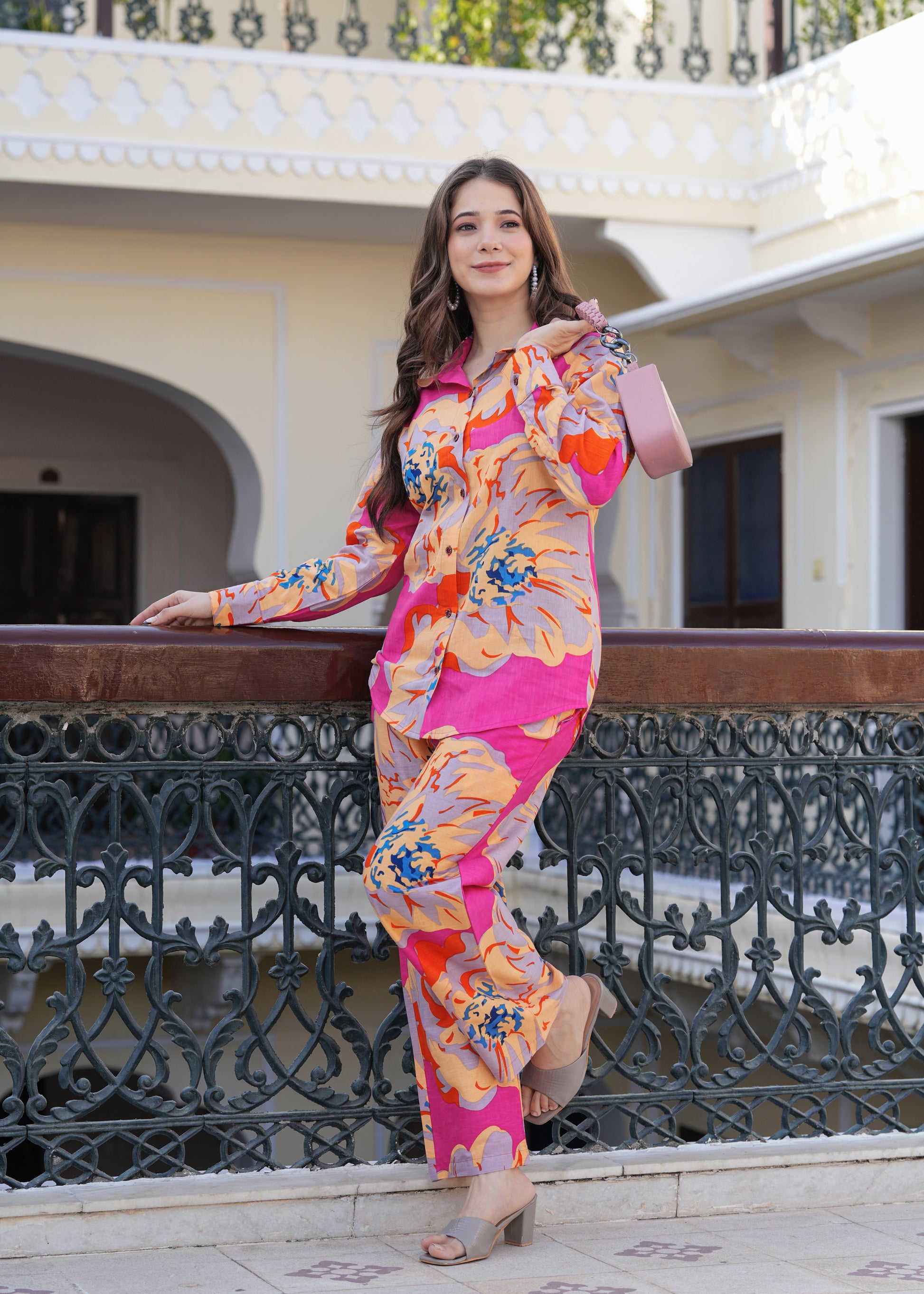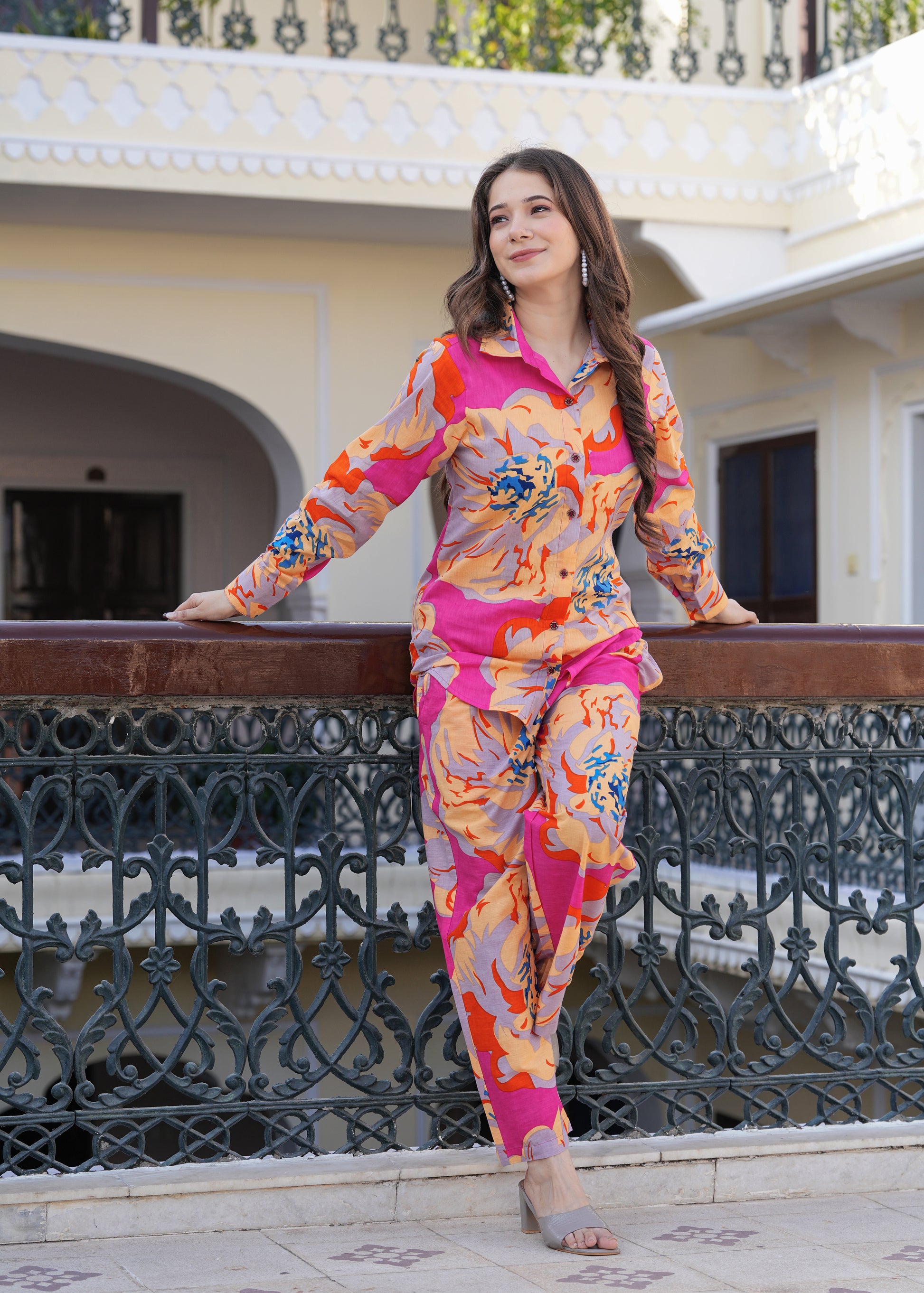 Elevate your everyday wardrobe with this pure cotton printed co-ord set in a soothing pink tone. The set includes a full-sleeve shirt with button-down detailing, tailored in soft, breathable cotton for all-day ease. The matching pants echo the same elegant print and material, ensuring a cohesive and relaxed fit. Perfect for casual brunches, travel days, or chic lounging.