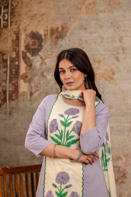 Pure Cotton Panel Hand Work Kurta Pant Dupatta Set